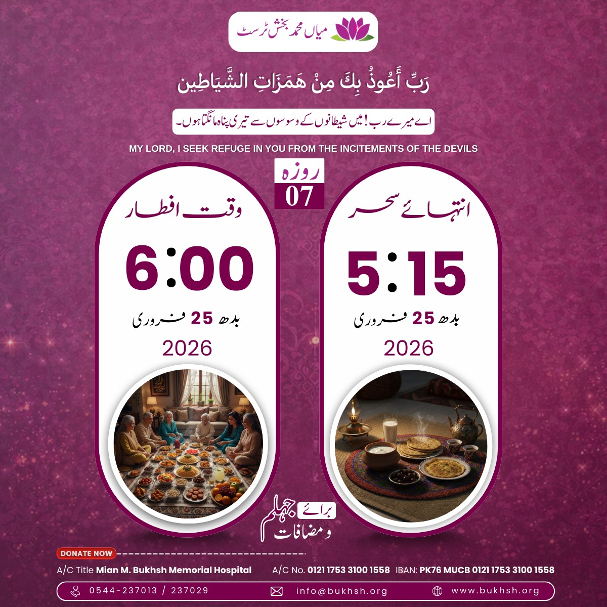 On 19 September 2021, a free camp for Dumb, Deaf and disabled children was organised by Mian Muhammad Bukhsh Trust (MMBT) Hospital at Kaluwal, Tehsil Dina, District Jhelum under the supervision of Prof. Dr. Abdul Rehman. Dr. Abdul Rehman examined 92 children.